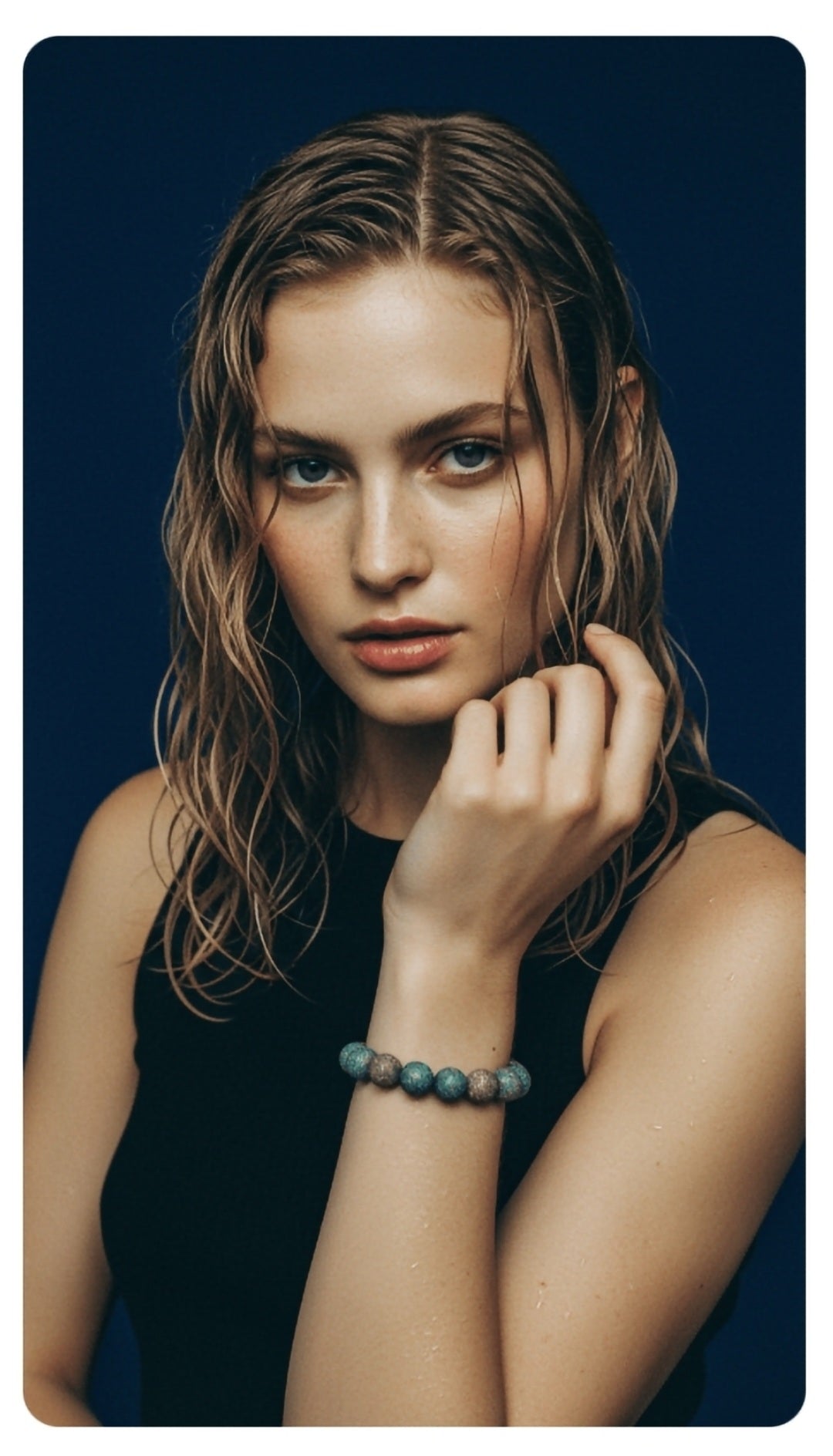 Crater Candy is a celebration of joyful resilience, forged from solidified volcanic lava transformed into a shimmering spectrum of colour. Through a unique treatment, each bead catches light with a glittery finish, like stardust scattered across a painter’s palette. The arrangement is fluid and expressive, evoking movement, creativity, and unapologetic vibrance.