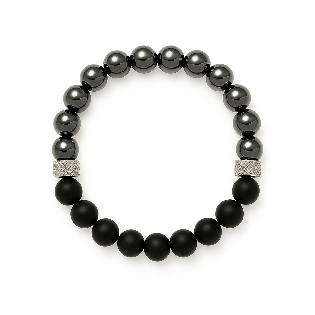 Forged from elemental clarity and industrial grace, Conducive Charm is a bracelet that invites alignment without force. Shungite, the ancient carbon shield, meets hematite’s magnetic grounding and steel’s resilient flow, each material chosen not for mysticism, but for its structural truth and symbolic architecture.