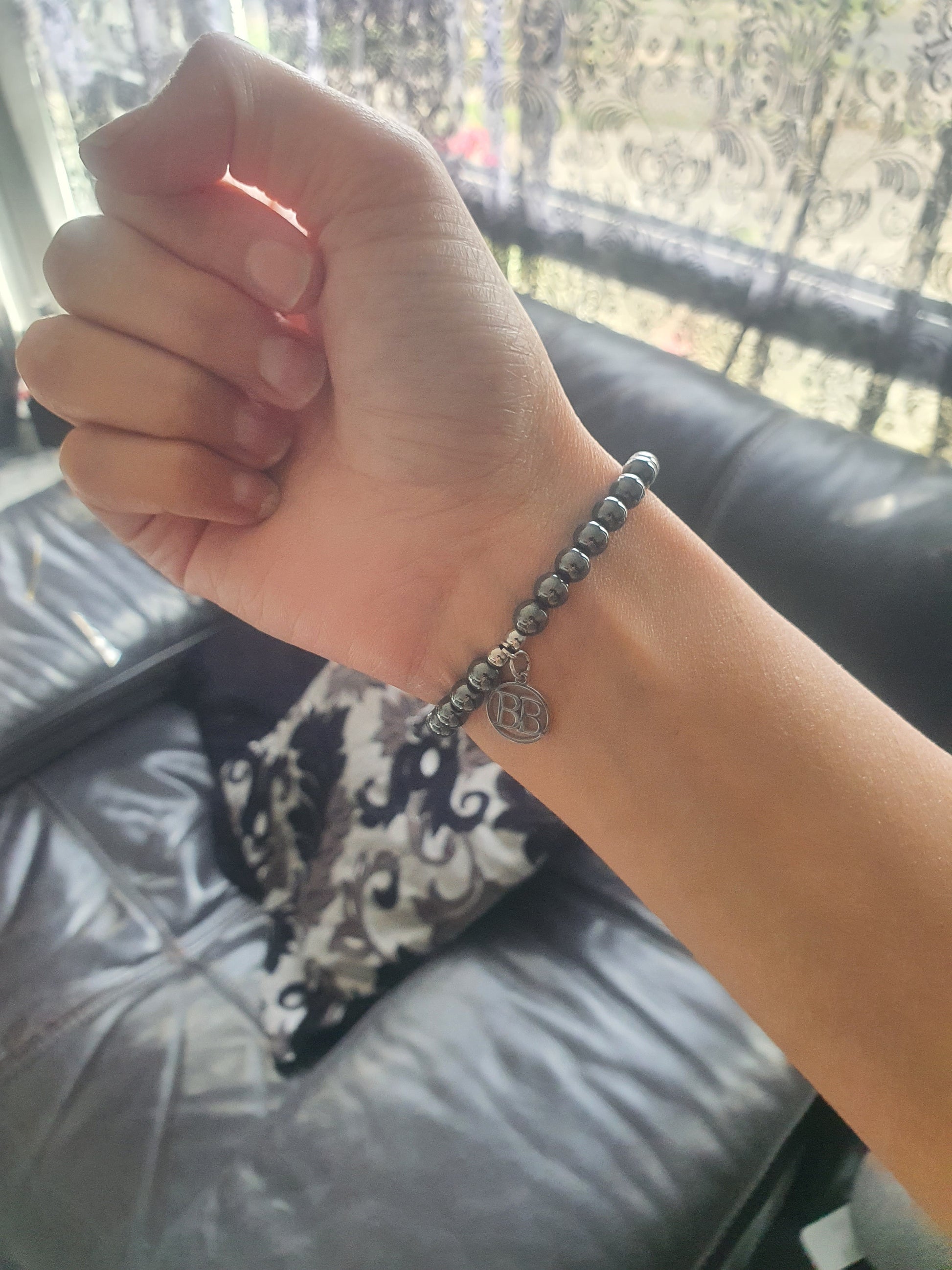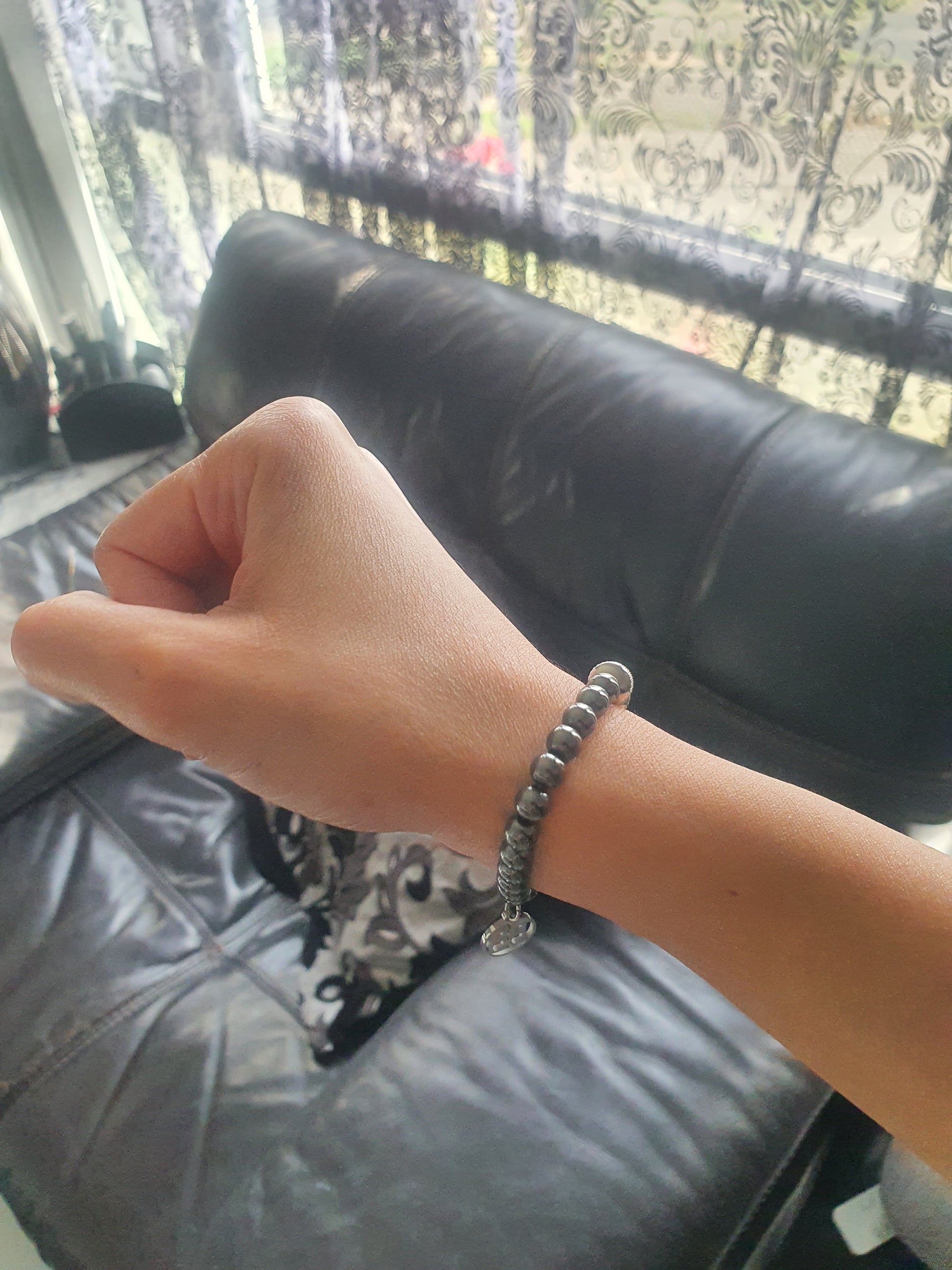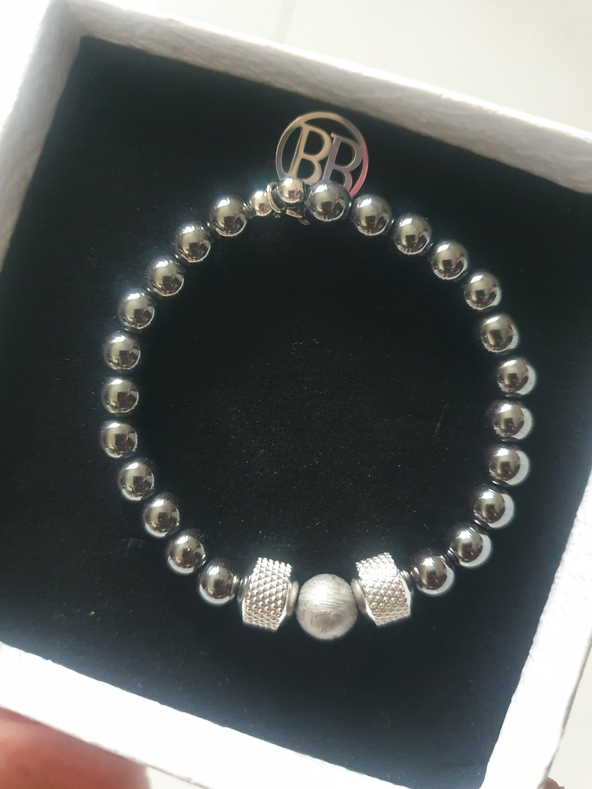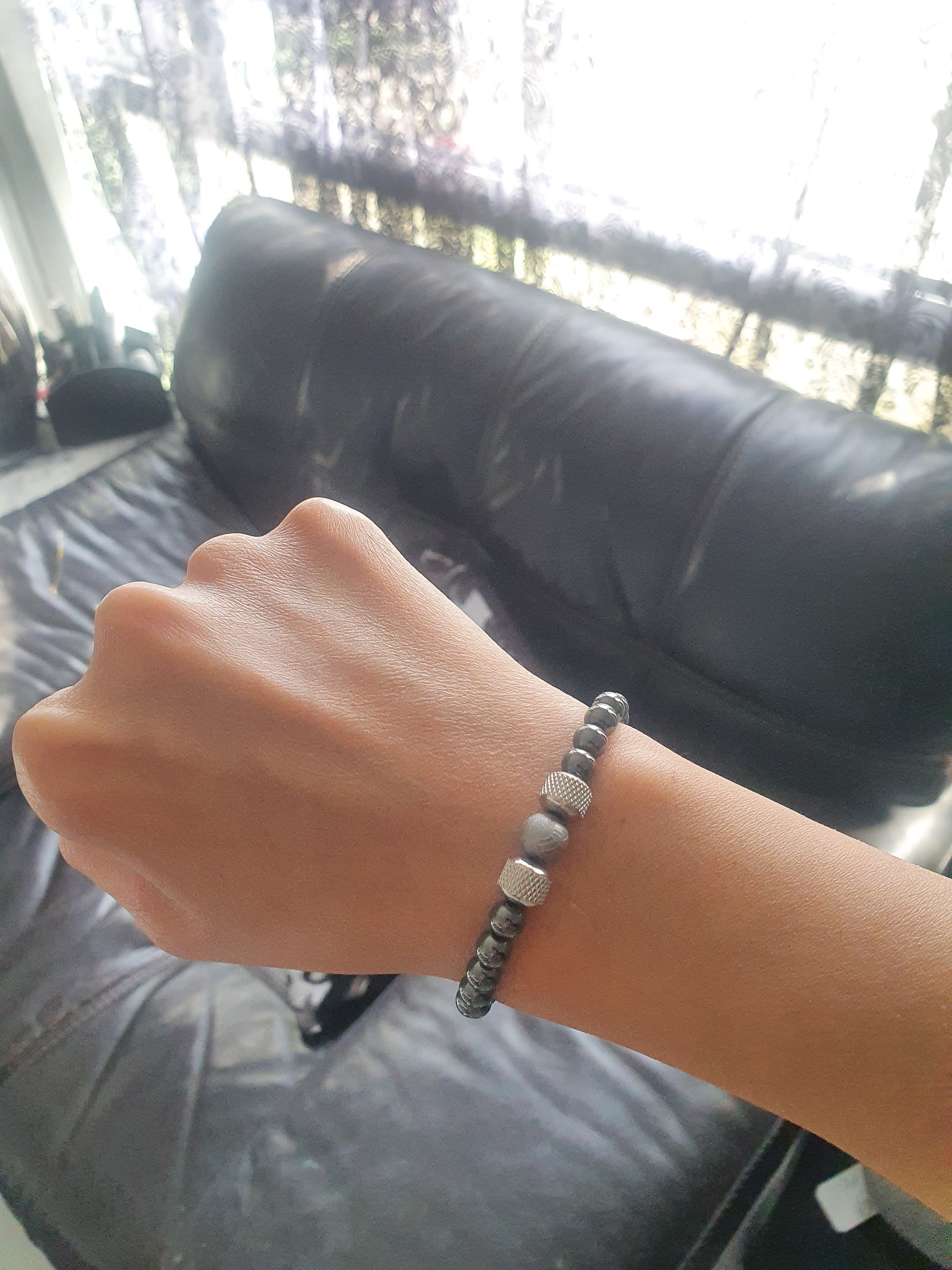 Named for the elemental journey it embodies, Iron Descent is a bracelet composed of 6mm hematite beads, each polished to a subtle metallic sheen that reflects the quiet resilience of iron. At its centre rests a single 8mm Aletai meteorite bead, framed by two stainless steel accents. The contrast is intentional: earthbound symmetry surrounding a fragment of the cosmos.