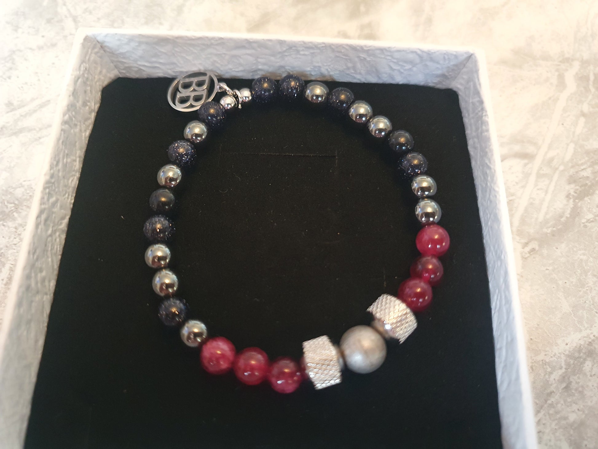 Interspersed among these are sparkling blue artista beads, shimmering like celestial lamps adorning the sky. They reflect divine beauty and cosmic mystery, echoing the stars that guide us through darkness. A stainless steel pendant completes the piece, anchoring its message: this is not mere adornment, but a missile of meaning, launched from the heavens, guided by strength, and pulsing with the fire of the heart.