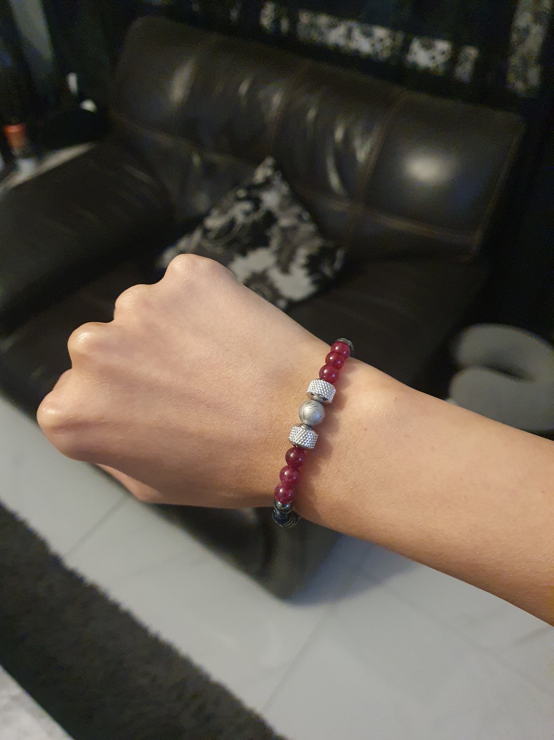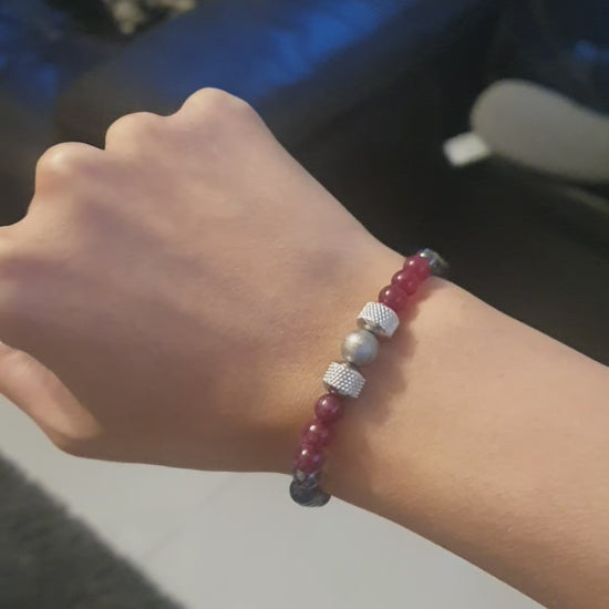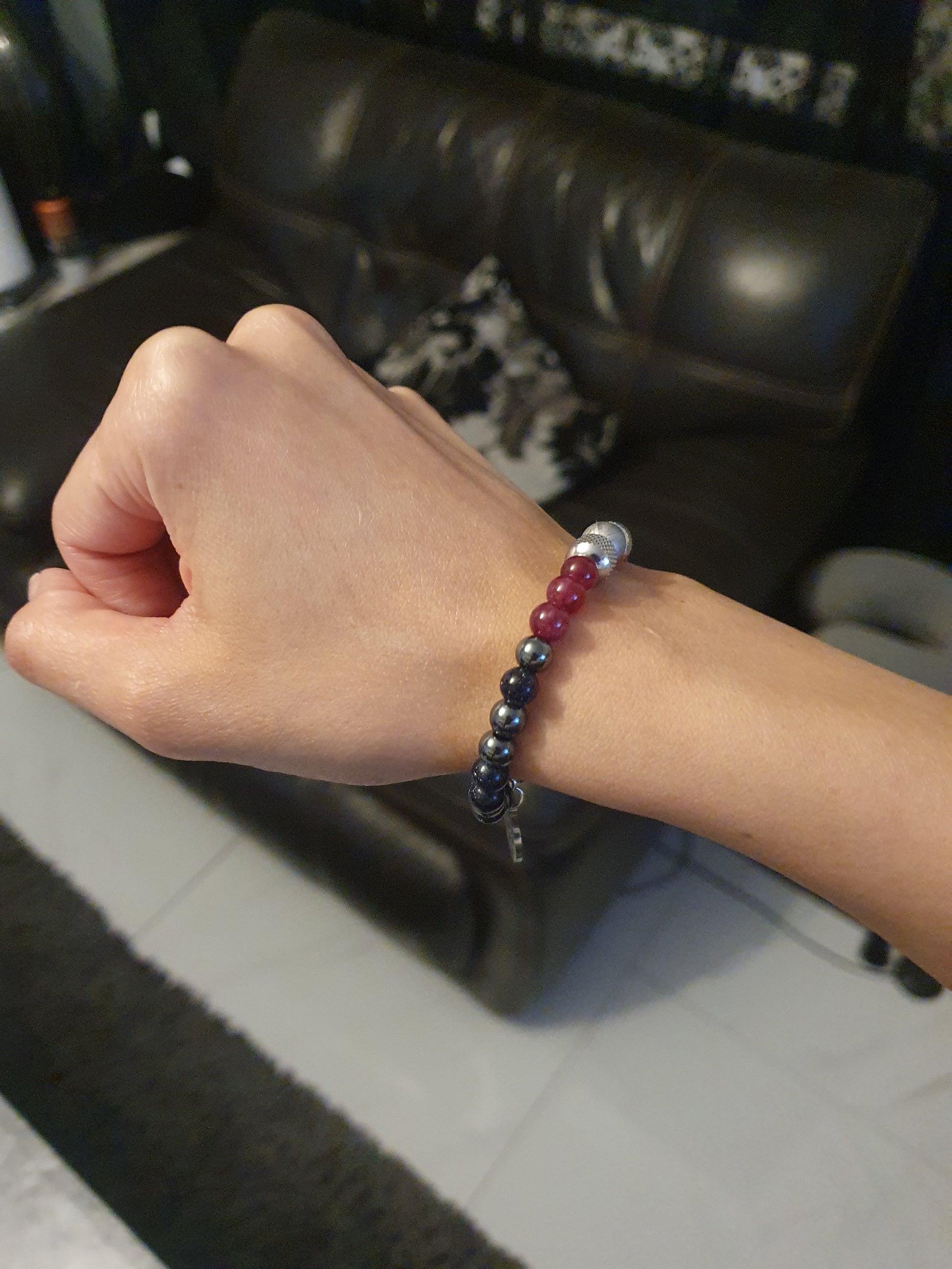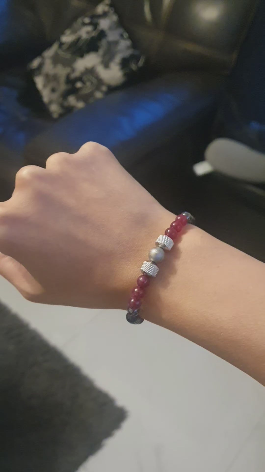 Surrounding this core is a rhythmic constellation of beads, each precisely sized at 6mm. Three garnets on each side burn with deep red fire, representing the heart’s desires, the seat of intention and spiritual awareness. Garnet is the pulse of longing, the emotional compass that seeks truth through action. These are followed by grounding hematite beads, offering strength against temptation and clarity in the face of inner conflict. Hematite is the anchor, the cool resistance to impulsive desire, the weight of wisdom.