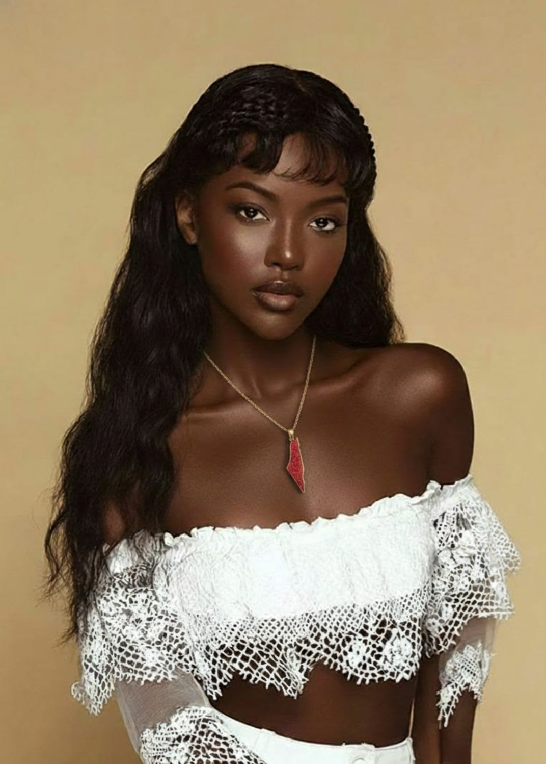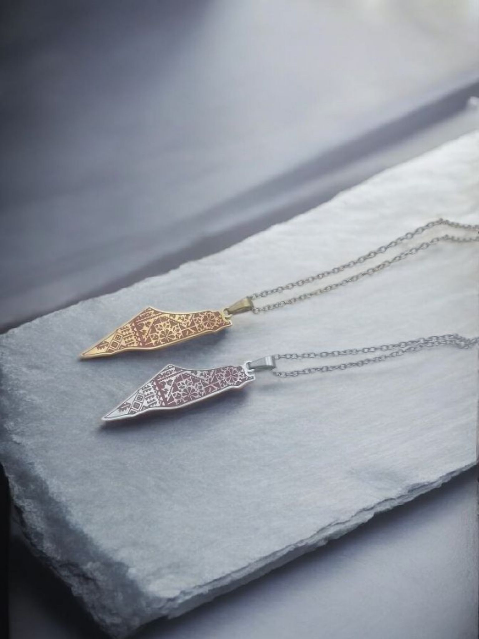 Threads of Palestine traces the outline of historic Palestine, adorned with intricate red and white motifs inspired by traditional tatreez embroidery, each stitch a symbol of resilience, heritage, and hope. Available in gold or silver finish, the pendant is crafted from high-quality stainless steel for lasting shine and durability. It hangs from a delicate matching chain, making it both a personal talisman and a gesture of solidarity. Whether worn as a stitched whisper of ancestral love or a map of memory carried close to the heart, Threads of Palestine is more than jewelry, it’s a story you wear. All profits from this necklace will go directly to support a Palestinian family.
